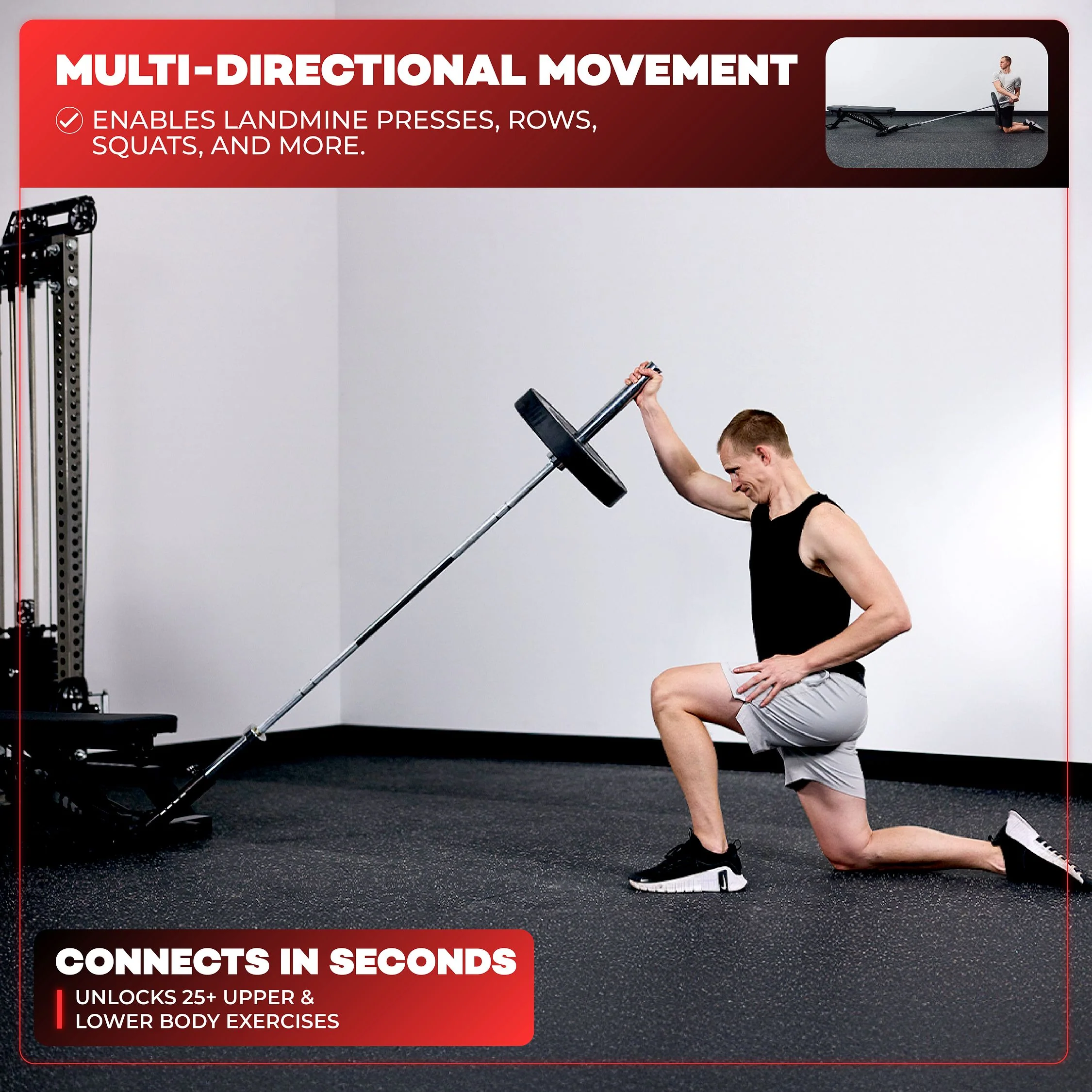 Multi-Directional Movement: Enables landmine presses, rows, squats, and more.