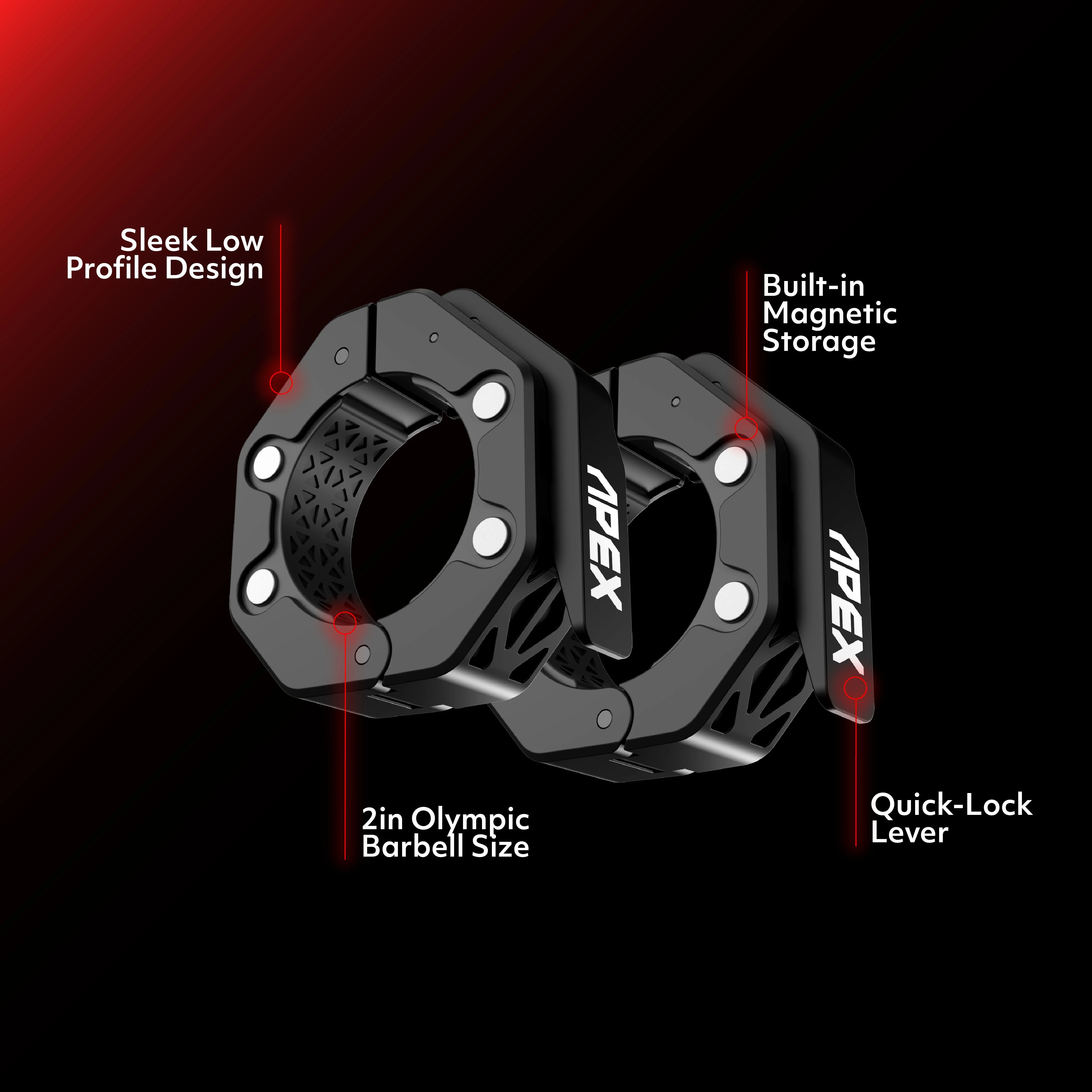 Designed for serious lifters, APEX Weight Clamps feature a low-profile design to maximize sleeve space and let you load more plates onto your equipment. Built with integrated magnets for secure storage and added convenience, these clamps deliver strength, speed, and reliability for every workout.